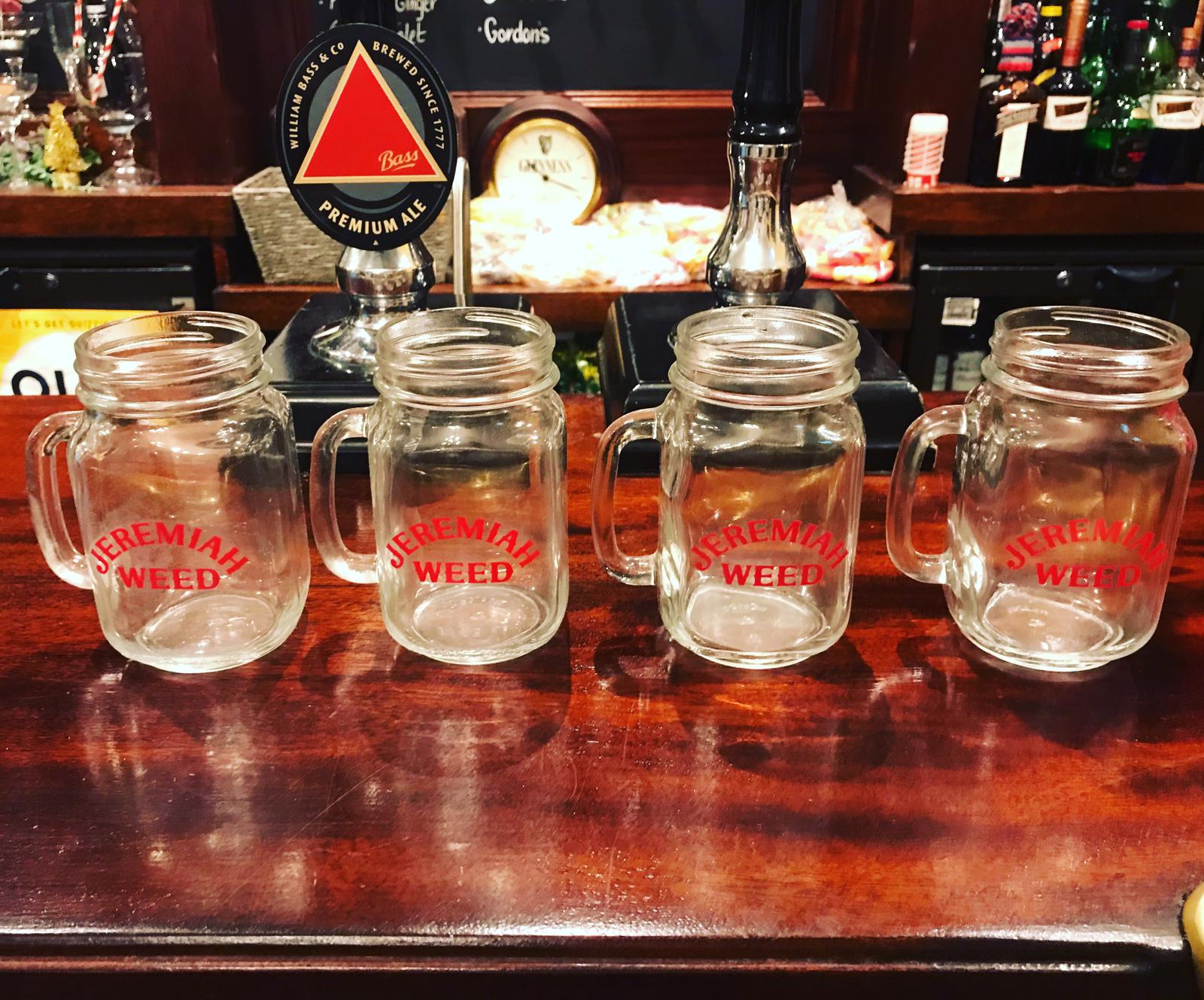 -This glass features a large, threaded rim, n large handle, a one pint capacity and the Jeremiah Weed logo in red on the front.