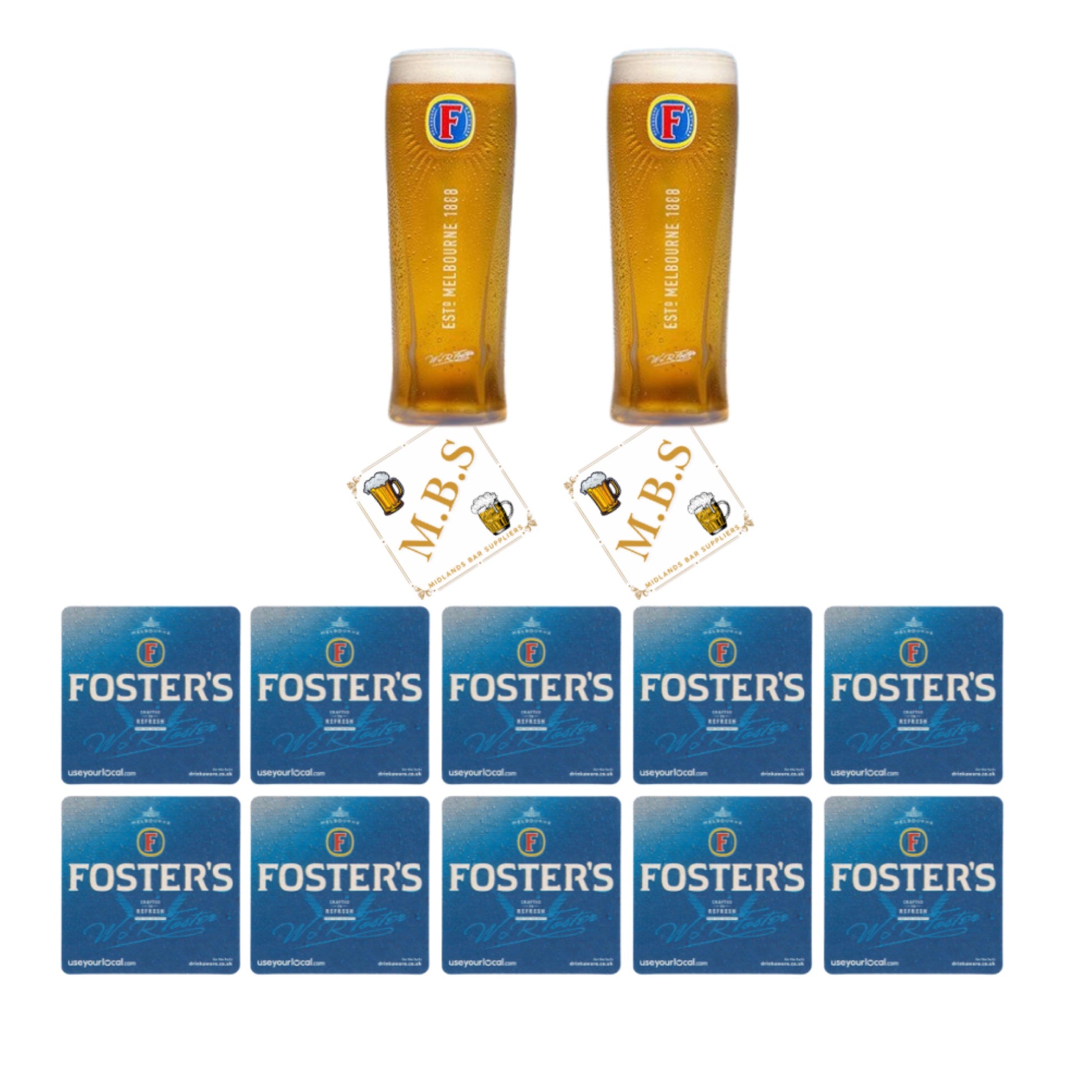 - AUTHENTIC SET: Complete Foster's beer drinking set including 2 genuine Foster's pint glasses and 10 official Foster's branded beer mats