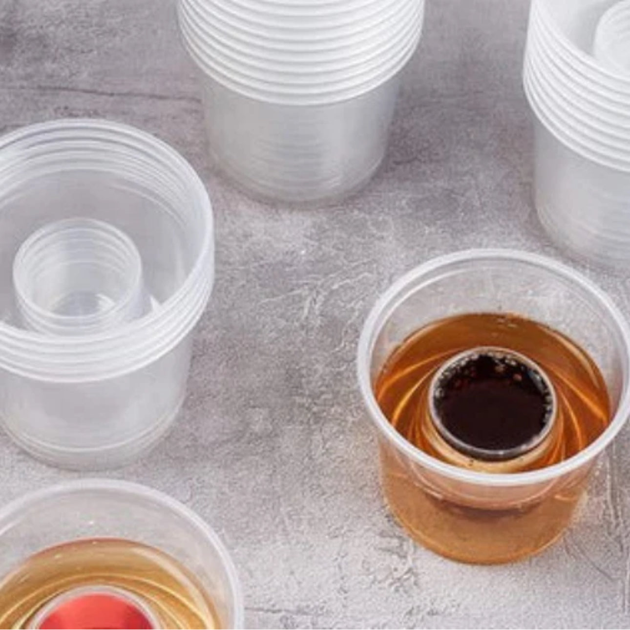 This is a disposable plastic shot glass designed primarily for Jagerbombs, mixers and chasers. The inner shot compartment is 25ml with an outer capacity of 60ml. The liqueur or spirit is first poured into the inner compartment; the outer section is then filled with the mixer. The glasses are designed to mix both compartments when consumed.