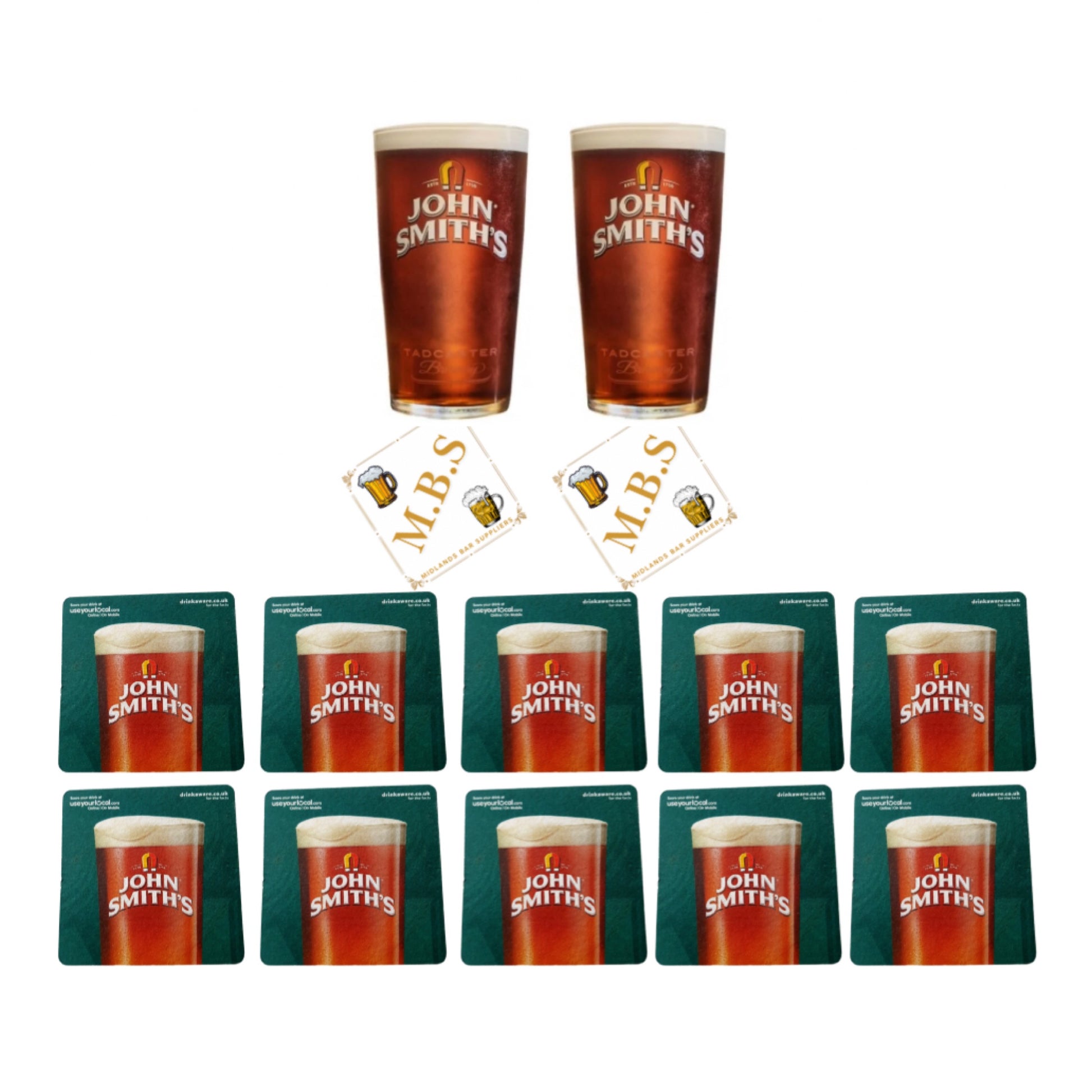 - COMPLETE SET: Package includes 2 John Smith's branded pint glasses and 10 matching beer mats, perfect for the authentic pub experience