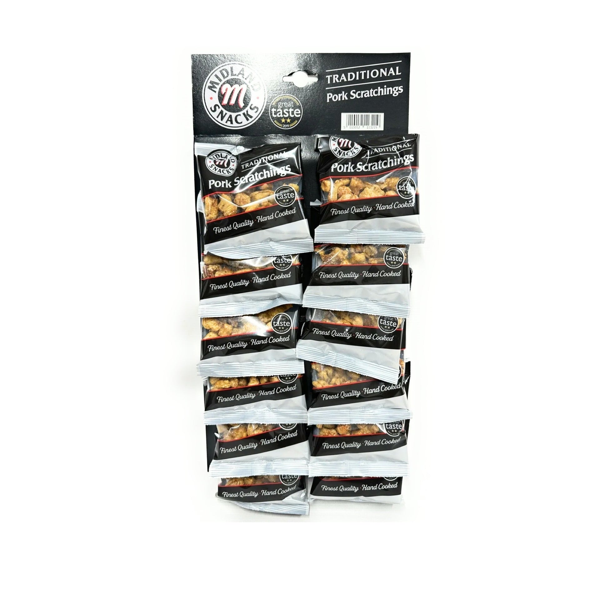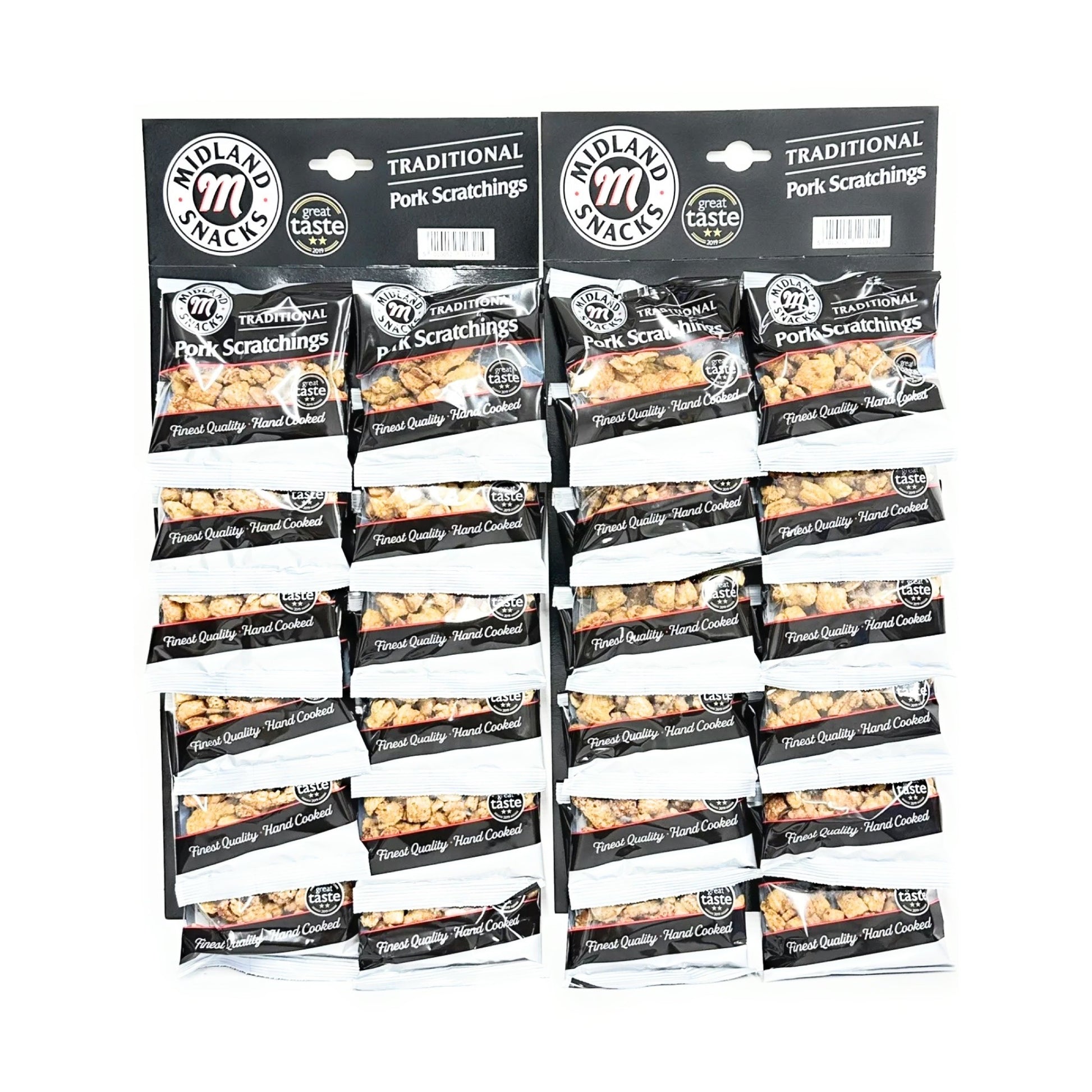 Indulge in a delicious savoury snack with these traditional pork scratchings from Midland Snacks. Each pack weighs 40g and contains 2 X 12 units of this seasoned meat snack. Perfect for pubs and a great addition to your pantry