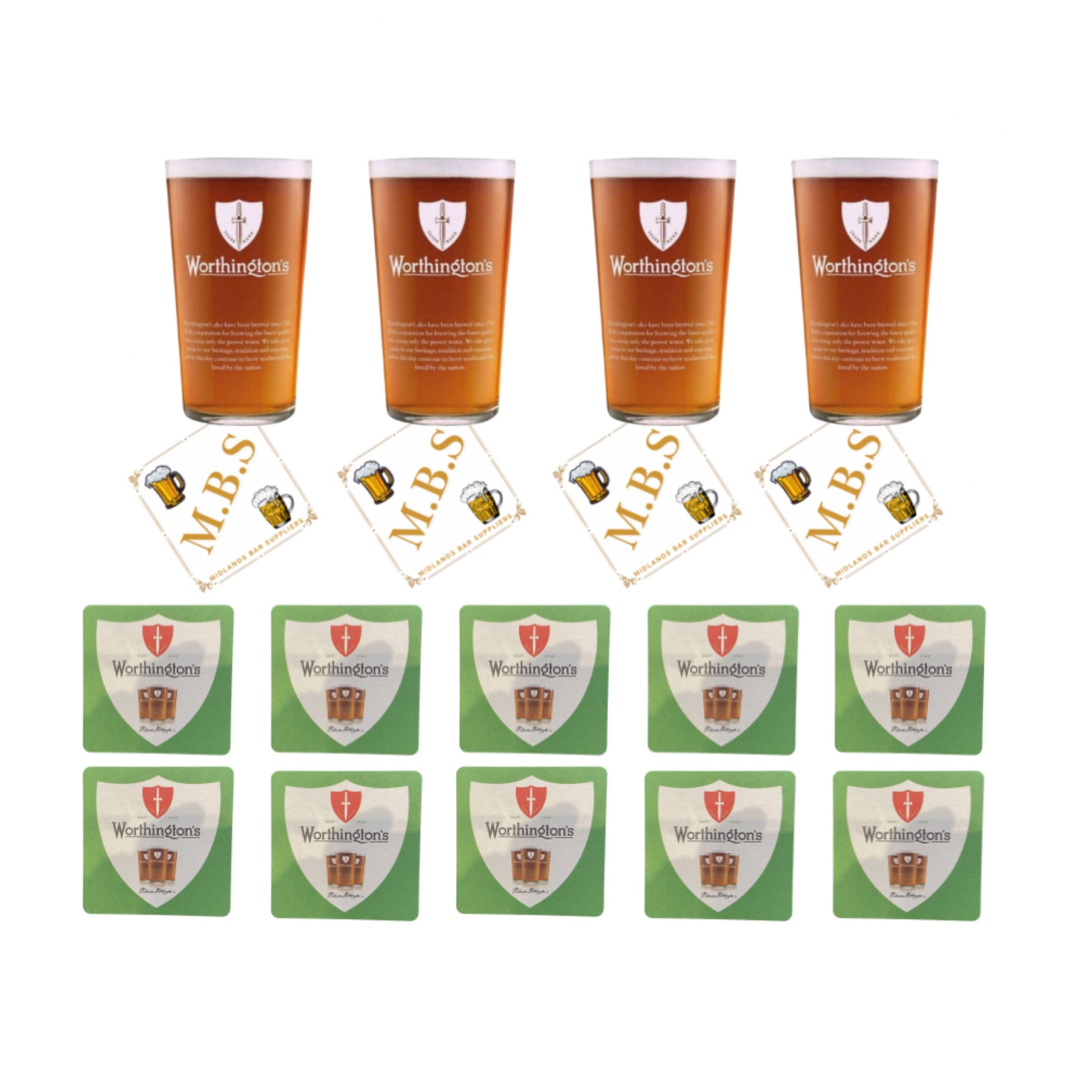 Worthington's Beer Glass Set with 4 Pint Glasses and 10 Beer Mats, Traditional English Style
